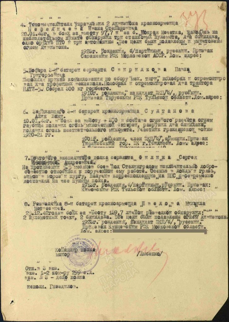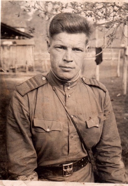 В 29 лет был призван на фронт Кимовским районным военным комиссариатом, воевал в составе 843 артиллерийского полка 299 стрелковой дивизии в воинской должности командира отделения. Кажется, о чем могут рассказать скупые справки и приказы того времени, которые до сих пор хранятся в семейном архиве? О многом. Просматриваешь их и с трудом веришь, что судьба одного человека может вместить столько событий, исключительных по значимости в нашей истории. Потертые коричневые корочки… Это медали «За отвагу» и «За боевые заслуги». Порыжевшее от времени удостоверение к медали «За оборону Сталинграда»… На протяжении 5,5 месяцев боев под Сталинградом дедушка исключительно добросовестно относился к порученной ему работе. Осенью в дождь и грязь, зимою в мороз и пургу получал корреспонденцию на полевой почтовой станции и своевременно доставлял ее на все пункты полка, за что 11 марта 1943 года был награжден медалью «За боевые заслуги».