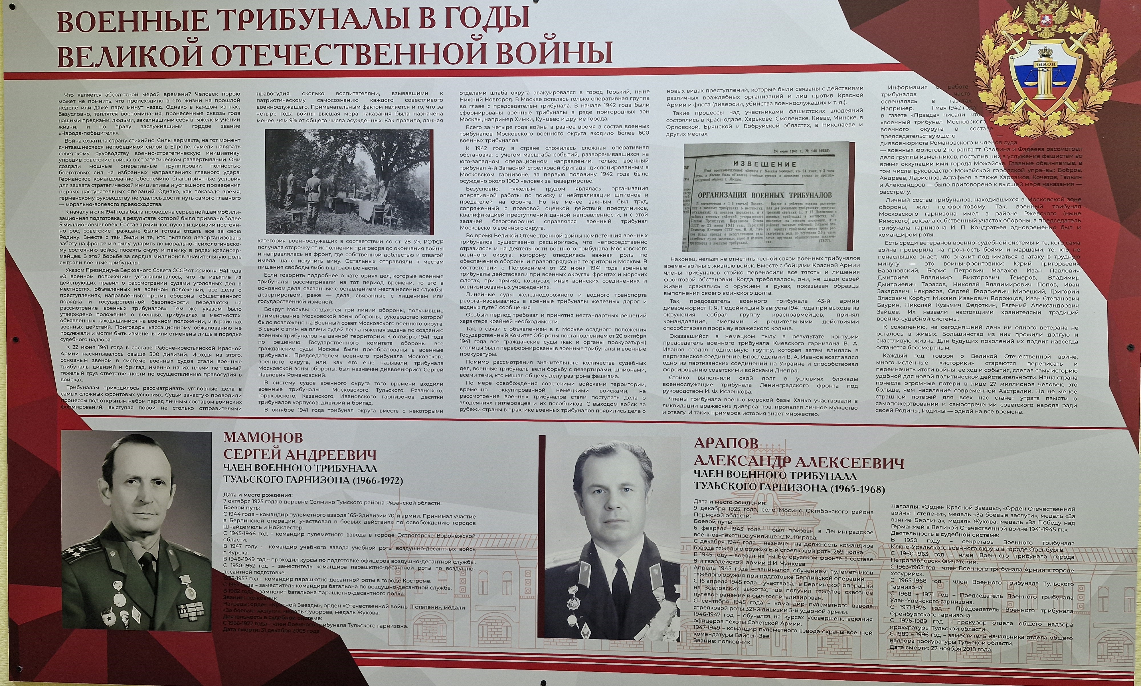 хищением или Есть среди ветеранов Военного трибунала Тульского гарнизона и те, кого сама война проверила на прочность боями и маршами, те, кто не понаслышке знает, что значит подниматься в атаку в трудную минуту, — это воины-фронтовики: Мамонов Сергей Андреевич (1925-2005) и Арапов Александр Алексеевич (1925-2018). В фойе военного суда вывешены картины - фотографии Городов-Героев Великой Отечественной войны с указанием важных дат и событий Победы и установлена настольная демосистема с фотографиями Героев обороны города Тулы и информацией об их подвигах.